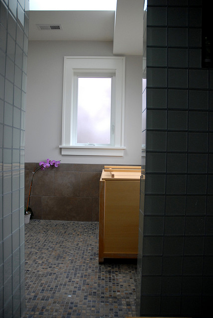 Farayi Chiro is originally from Zimbabwe. As a nod to his culture, Shona stone sculptures from Zimbabwe decorate the wet area. In the dry area hangs a framed travel poster for Vietnam from the 1950s, part of SJ’s grandfather’s (a South East Asian Anthropologist) collection. Frosted glass windows sit at the height of the soaking tub on two sides, and two skylights let in lots of natural light, contributing to the benefit of healthful relaxation for the whole family. This family bath features both a sauna and a traditional Japanese soaking tub-- hand crafted by the Alaskan company Sea Otter Wood Works as well as a large walk in shower covered in glass tile along with large glass paneling helps separate the “dry area” (vanity and toilet) from the “wet area” (sauna, tub and shower).